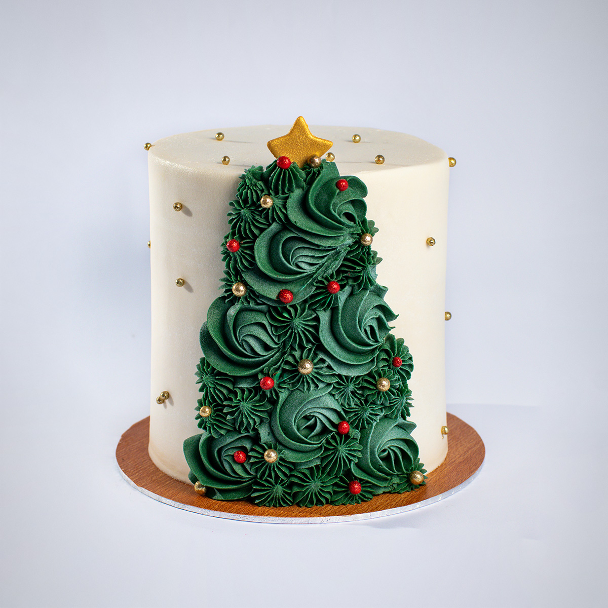 A dreamy festive delight wrapped in smooth white buttercream and sprinkled with elegant gold accents. Featuring a stunning piped Christmas tree made of lush green swirls, dotted with red and gold baubles and crowned with a golden star, this cake brings pure holiday charm to any celebration. It's the perfect show-stopping centrepiece for gifting or gatherings. 🎄 Decorations and colours may vary slightly from the picture.