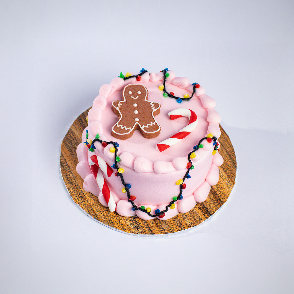 A merry little cutie for anyone wanting to sprinkle Christmas magic! Frosted in soft pink vanilla buttercream and topped with a smiling gingerbread buddy, candy canes, and teeny twinkle lights, this cake is pure holiday happiness. The perfect way to add a dose of adorable to your Christmas celebrations! 🎄Please note: This cake comes packaged in our mini-sized cake box, and not our lunchbox packaging. Decorations and colours may vary slightly from the picture.